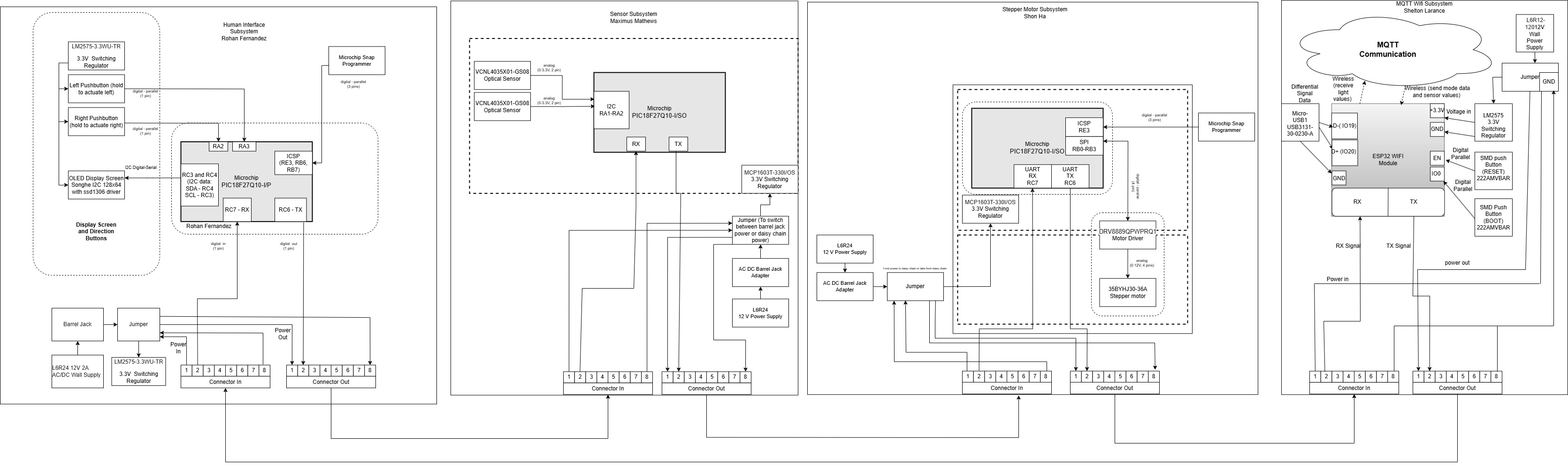 We structured the message to incorporate an order for our data to help streamline the reading of our data from our individual subsystems. We start with the mode data, which helps determine the current mode for the system. Since the mode data is first in the data string, it immediately lets the motor system know what to look for. This helps decrease the lag in the system and optimize the system more. Next, we have the data from the two sensors, which is placed directly after the mode data. Since the system will start in automatic mode and will stay in automatic mode for the most part, the data for the sensors should be placed relatively to the front of the message, and the data for the buttons would be ignored, decreasing the overall lag of the system. Finally, we have the button data at the end of the message. Since the system will rarely be in manual mode, the button data is passed on last, and this will help streamline the process of looping through the daisy chain.